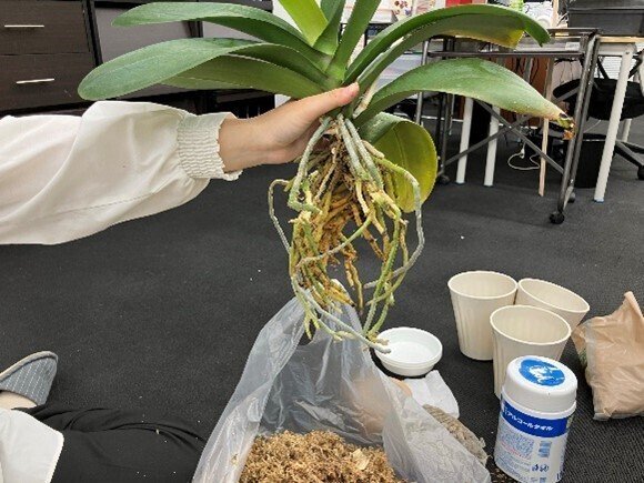 広報メンバーは5人いるので、それぞれ1つずつ担当して植え替えを行いましたよ!かがっちさんだけが唯一胡蝶蘭の植え替えを経験されていたので、1から順に説明していただきながらスタートしました。・なぜ植え替えが必要なの?