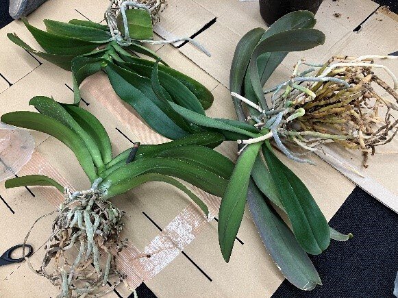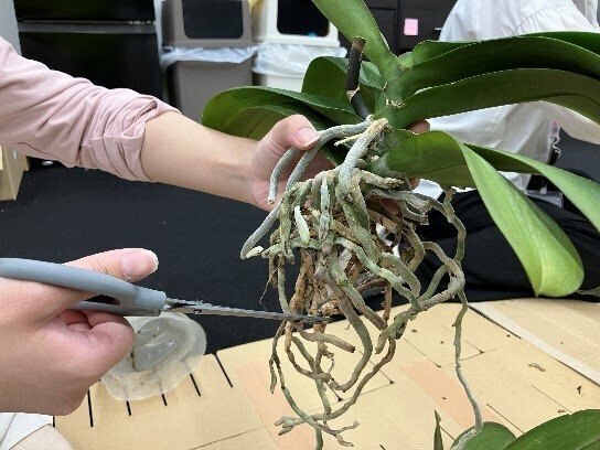 胡蝶蘭を取り出せたら、次は根の状態をチェックし切る部分を選定していきます。黒くなっていたり、枯れていたり、ぐにゃぐにゃしている根は、清潔なハサミを使って切っていきましょう!白くて張りのある根は健康な根っこなので、間違えて切ってしまわないようご注意ください。リカ達は切った後すぐ作業を進めましたが、本当は1日程度風通しのいい日陰で乾かすと、切り口が乾燥して雑菌が入りにくいそうです!